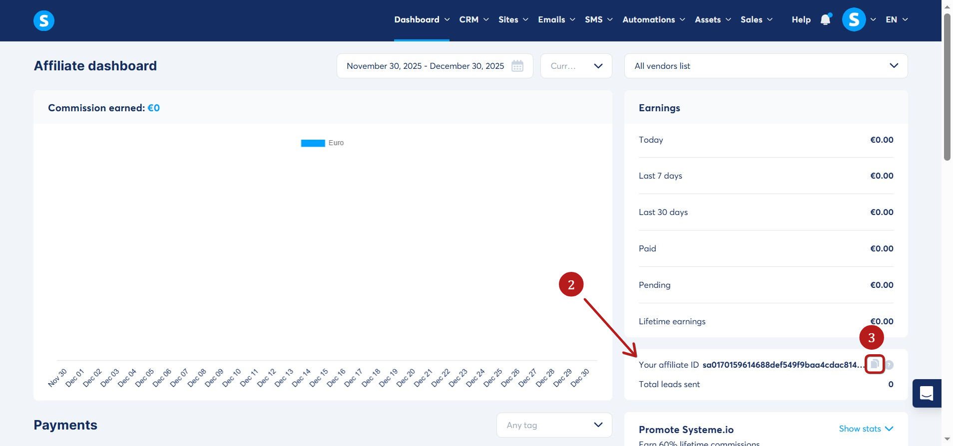 Here, you will find your affiliate ID (2). To copy it, click the copy icon (3)