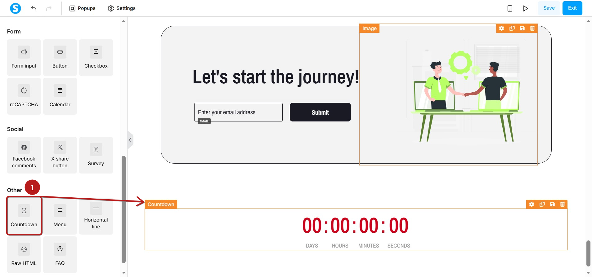 In the page editor, drag the Countdown element (1) from the left panel and drop it onto your page.