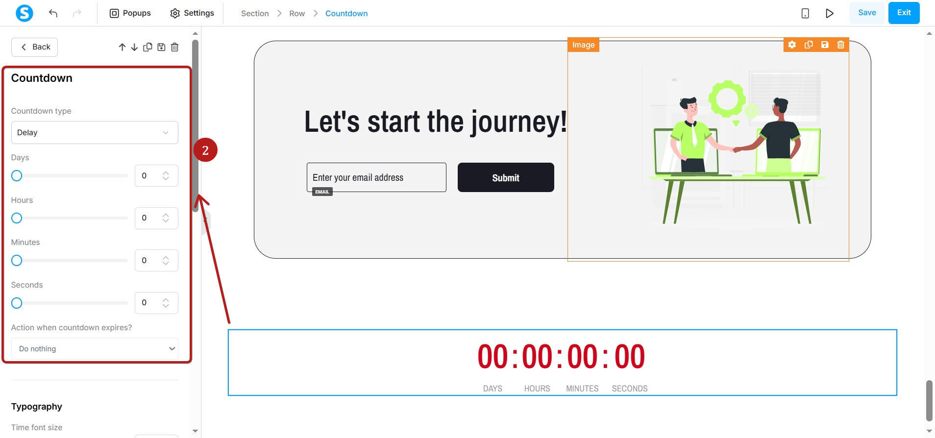 Click the timer to display its settings (2) in the left panel. In the Countdown type field, choose the Delay.