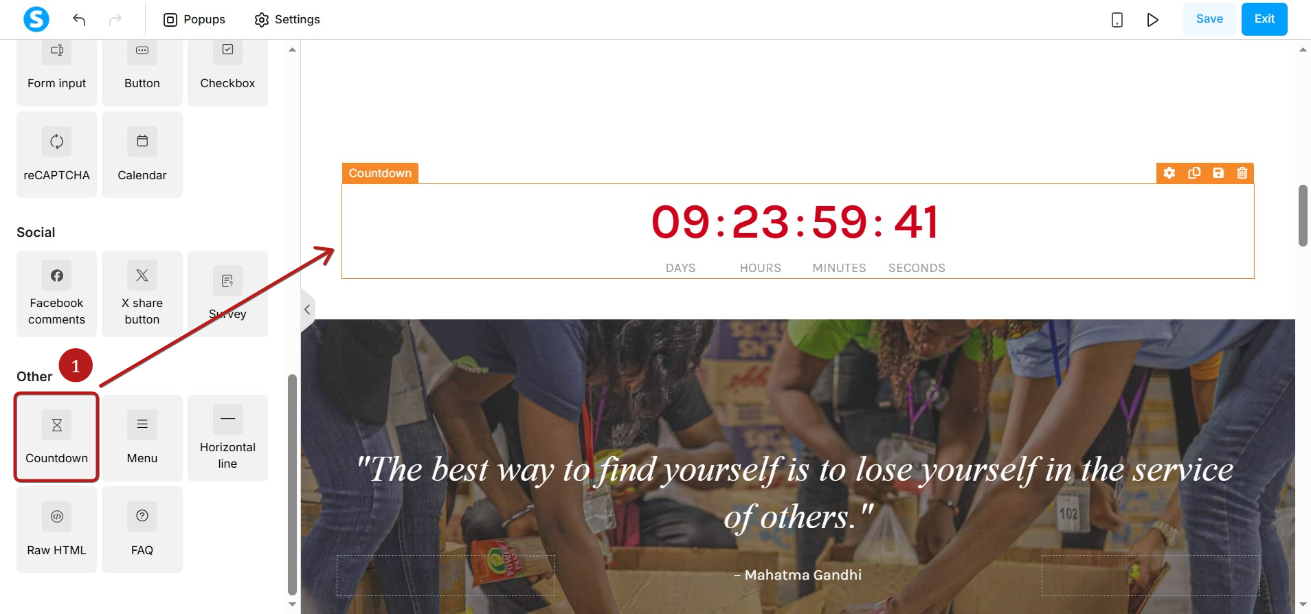 In the page editor, drag the Countdown element (1) from the left panel, and drop it onto your page.