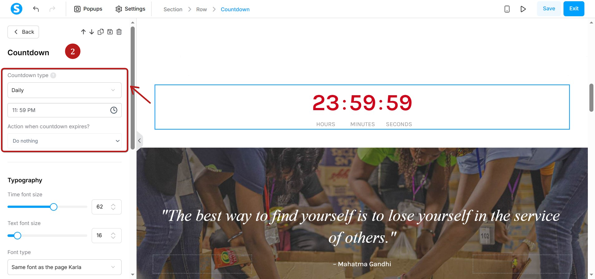 Click the timer element to view its settings in the left panel. Under Countdown type, select Daily from from the list of options (2).