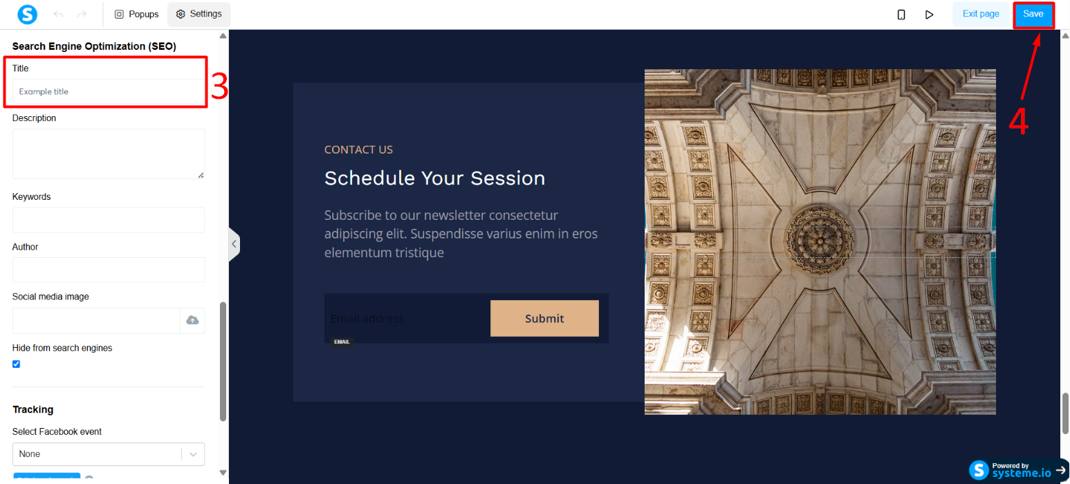 In the side menu, scroll down to the "Search Engine Optimization (SEO)" section and enter the title to be displayed in the "Title" field. (number 3 in the image)