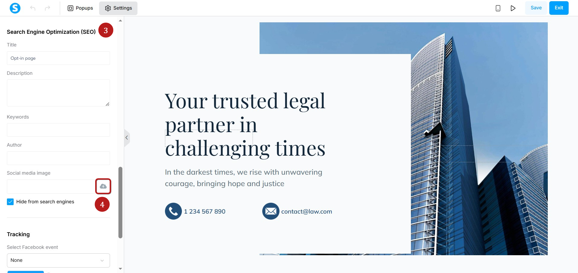 On the Settings tab, scroll down to the Search Engine Optimization (SEO) section (3), where you will find the Social media image field. Click the Upload icon (4) to choose the image that will appear on social networks.