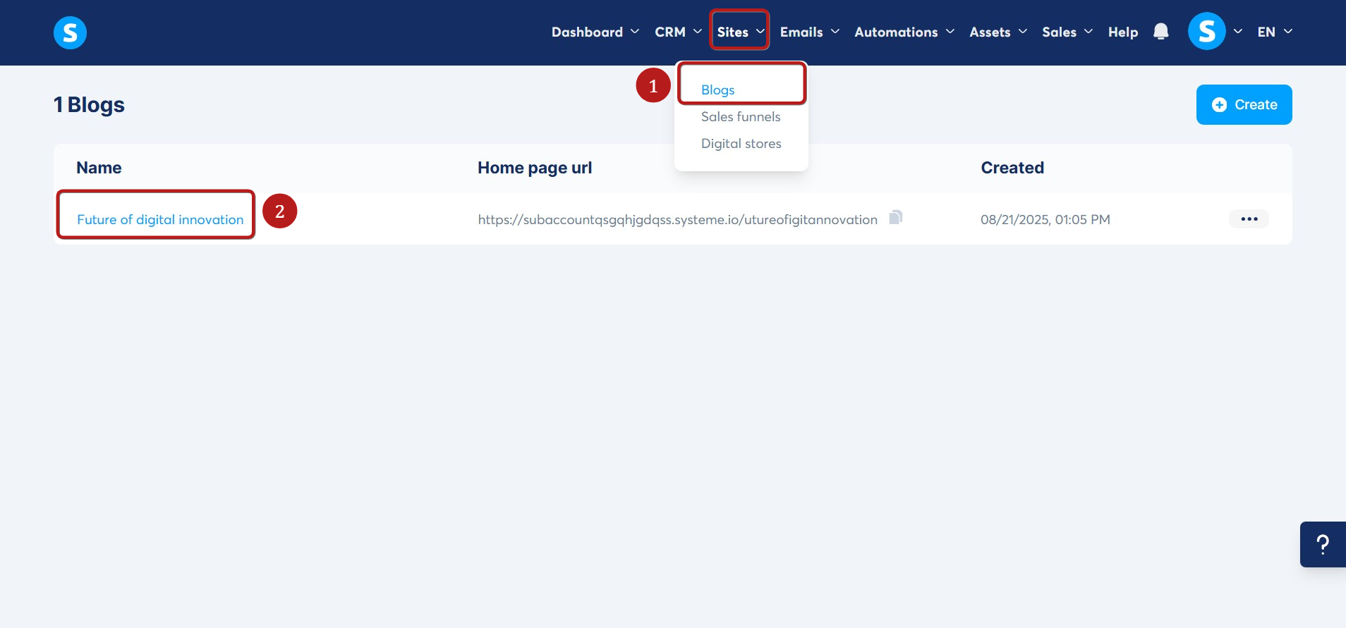 Navigate to the Blogs on the Sites tab (1). Next, click on the title of your blog (2).
