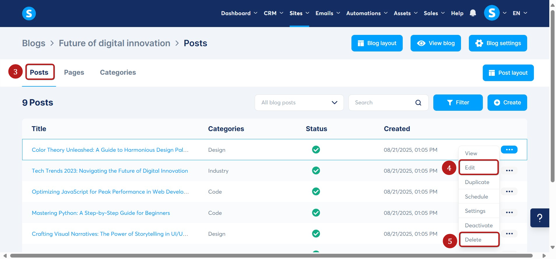 Once you're on your blog's menu, go to the Posts section (3). You'll notice that some default posts were created when you initially set up your blog. You can modify these posts by clicking on the three dots and selecting Edit (4) or by clicking directly on the title of the post, and you can delete it by clicking on delete (5).