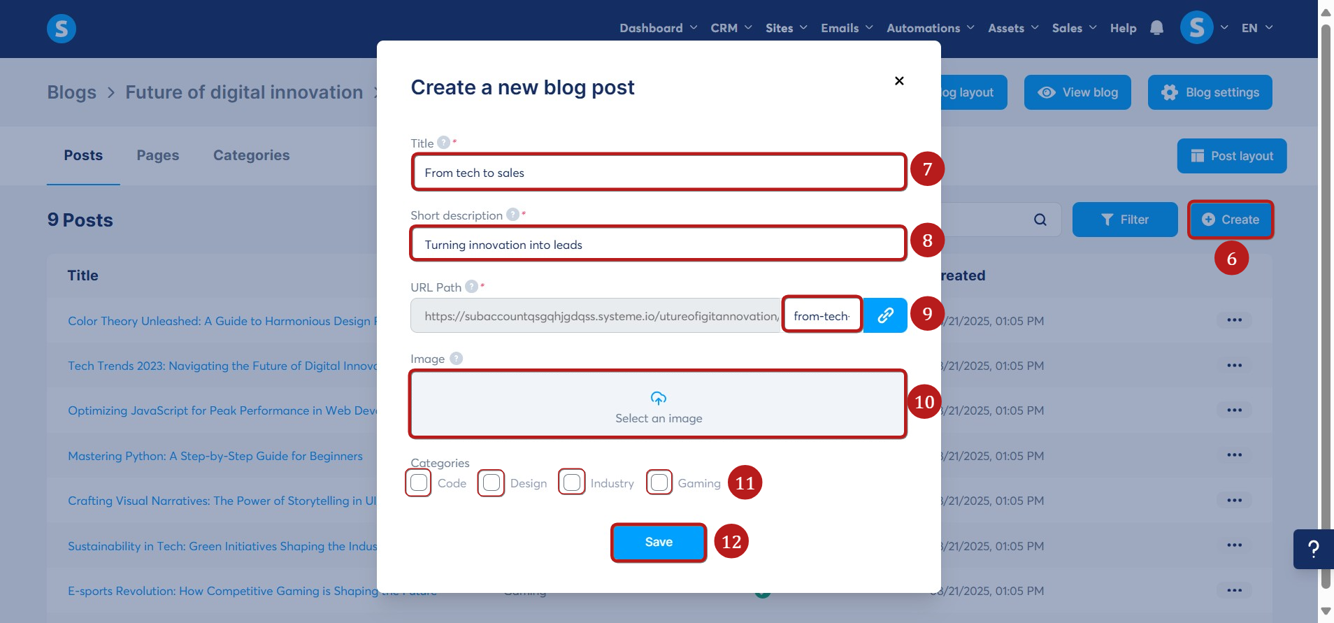 To create a new blog post, simply click on the Create (6). A pop-up will appear, and you must fill in the input fields as follows: