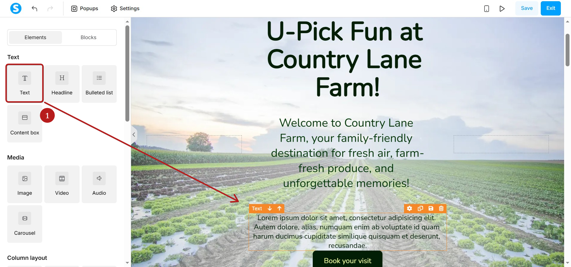 In the page editor, drag and drop the Text element (1) onto your page.