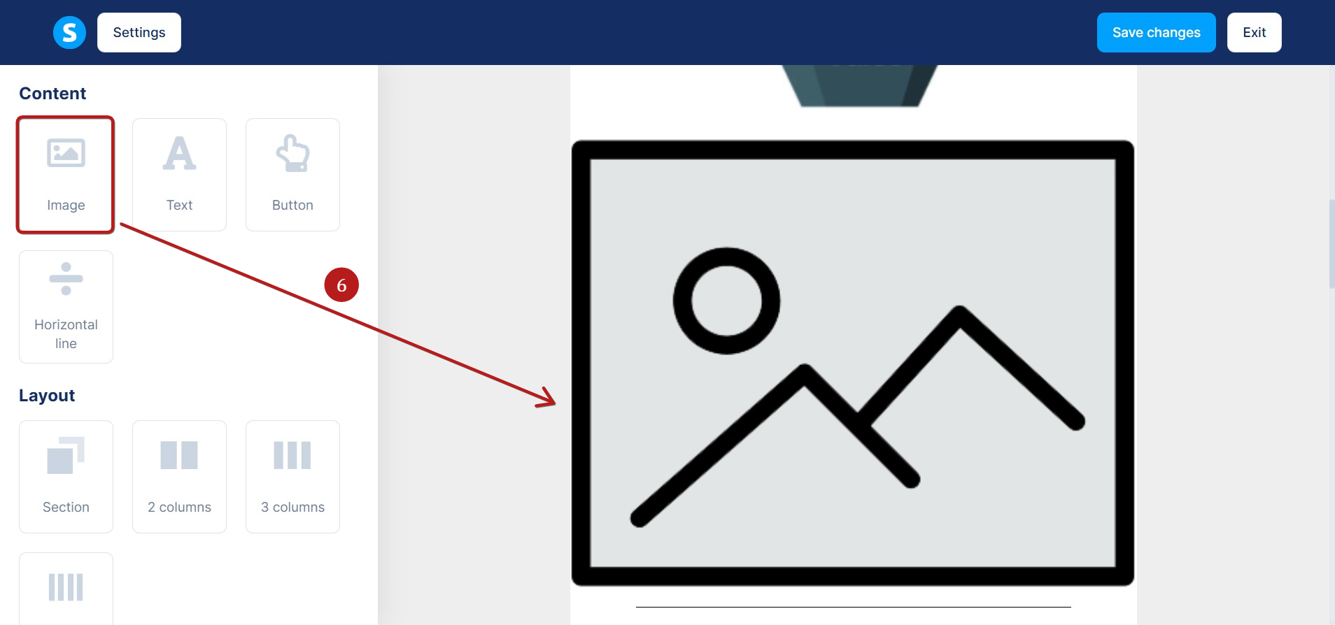 In the visual email editor, drag and drop the Image element onto the editor (6).