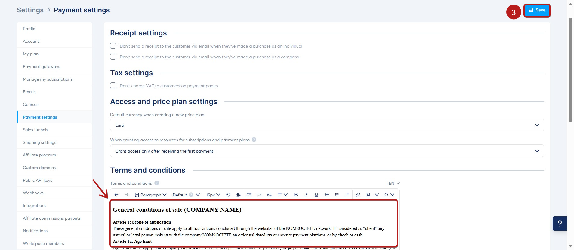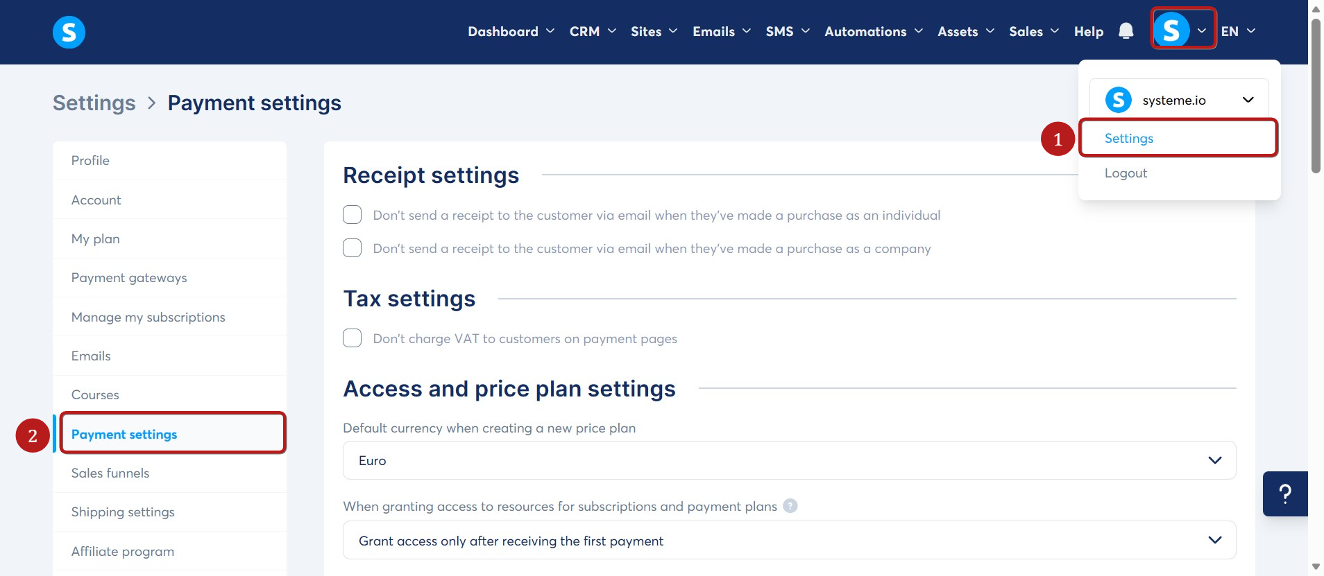 To modify the terms and conditions text on your order forms, navigate to Settings (1) by clicking on your profile picture, then click on Payment settings (2).