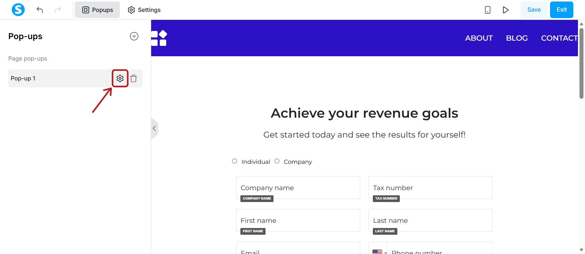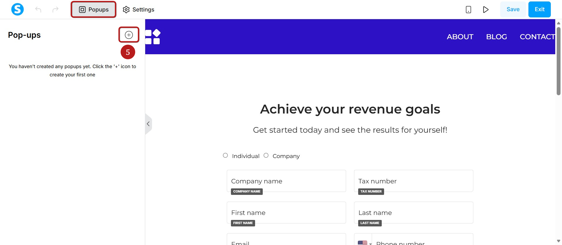 Once inside the editor, click on Popups, then click the + icon to add a new popup (5).