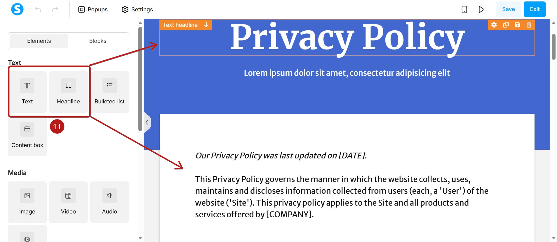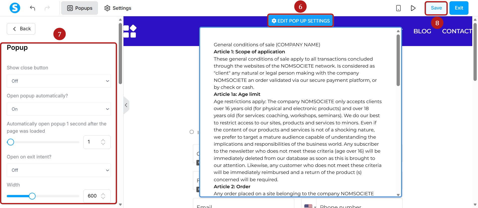 Once the popup is displayed, click on Edit popup settings (6) and select the text element containing the terms and conditions (7).