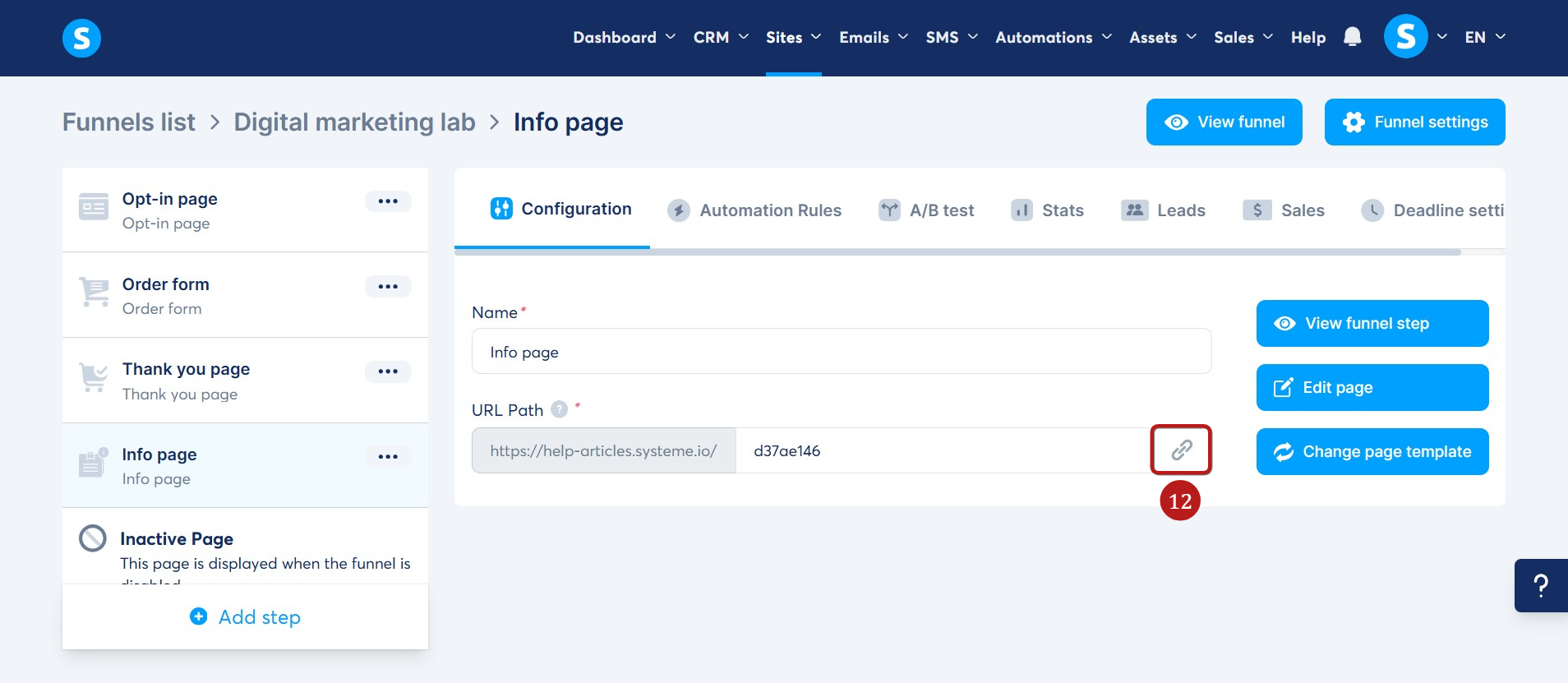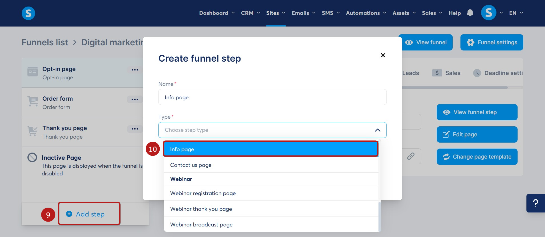 Begin by creating a new page for your terms. Click Add step (9) and select Info page (10) as the page type.