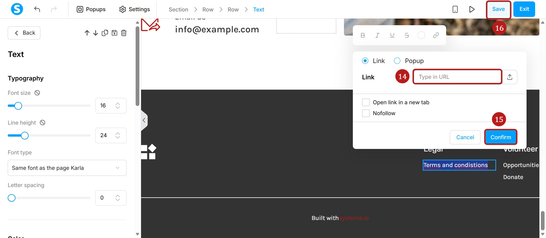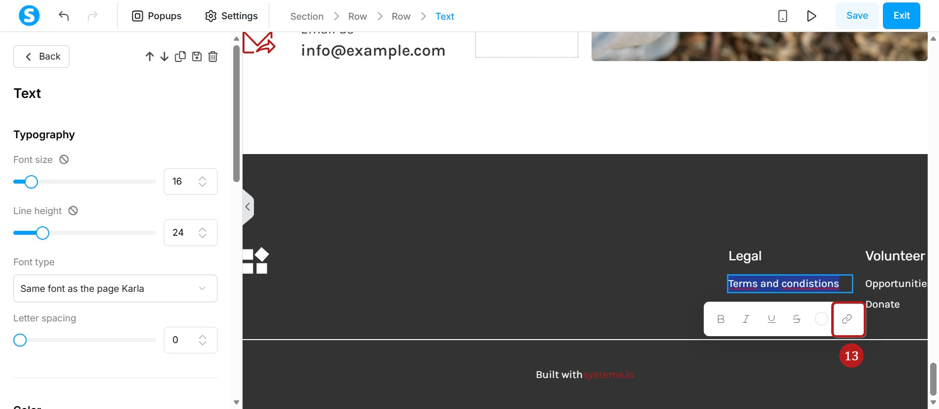 In your sales page editor, add a text element. Highlight the text and click the Link icon to create a hyperlink (13).