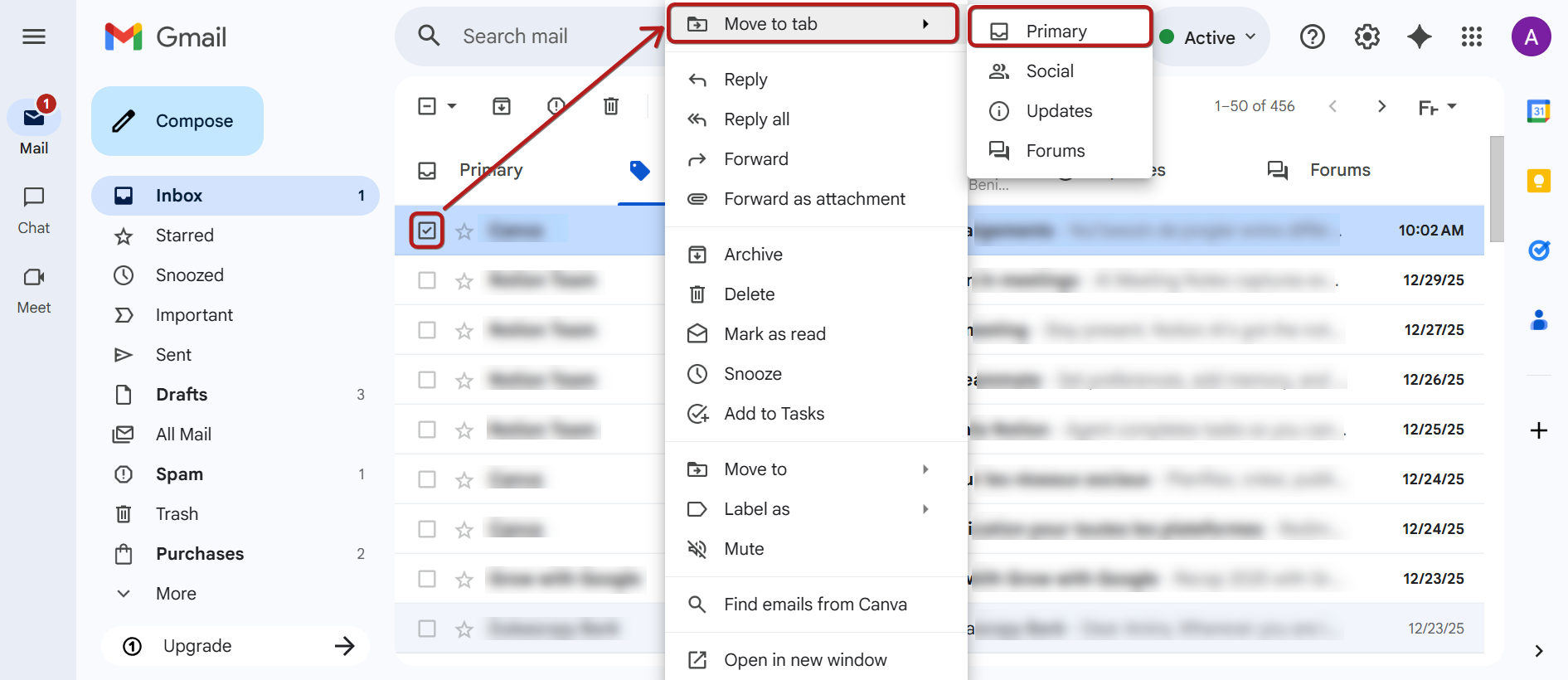Select the mail > Right-click on the mouse > "Move to tab" > Choose "Primary".