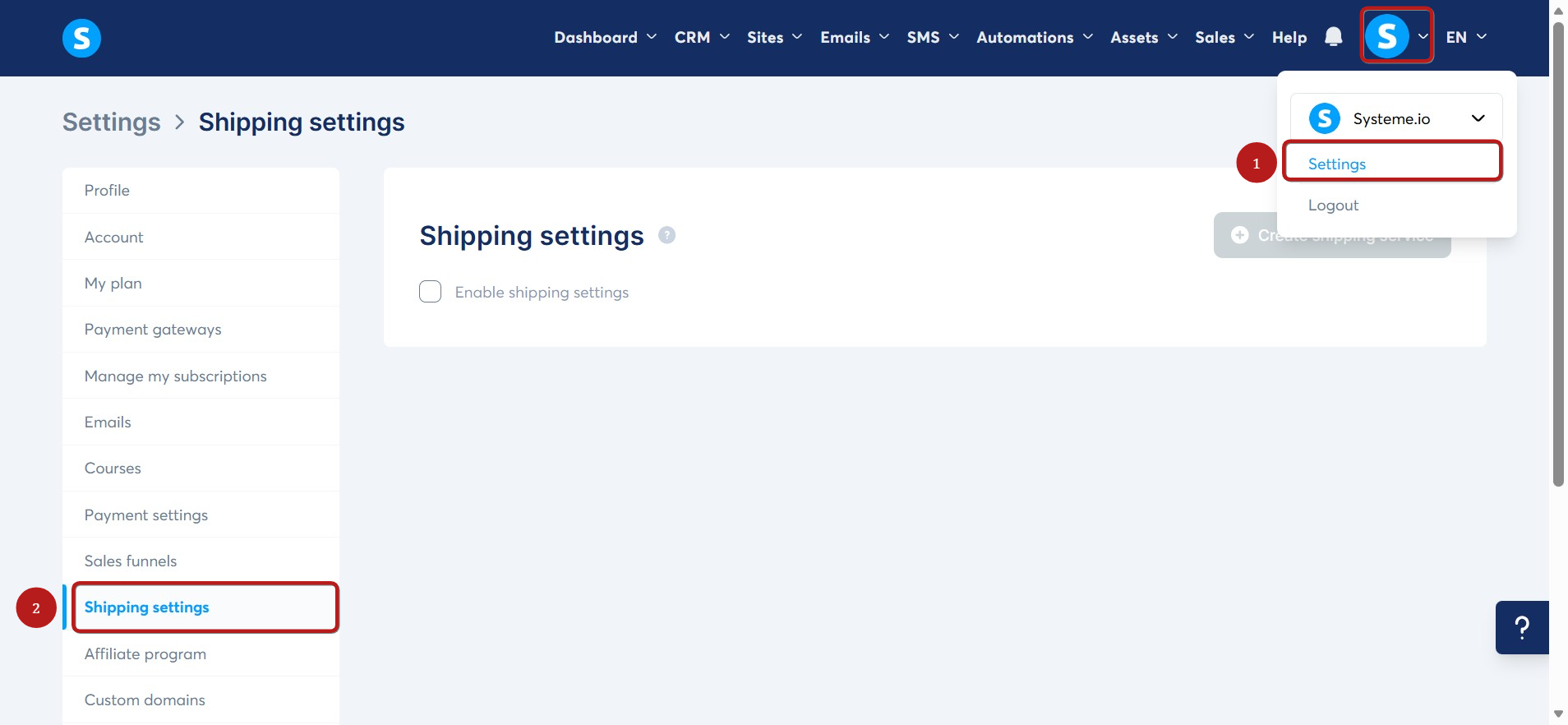 To enable shipping fees, click on your profile picture, go to the Settings section (1), then click on Shipping Settings (2).