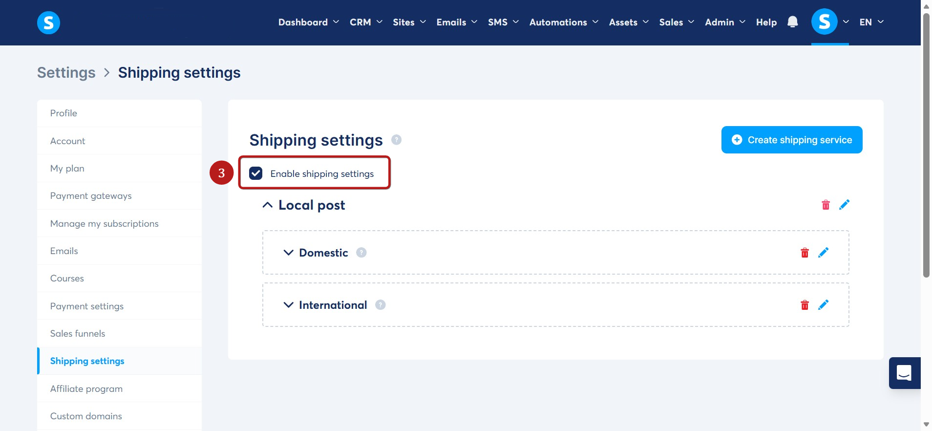 Check the box for Enable shipping settings (3) to start creating a shipping method.