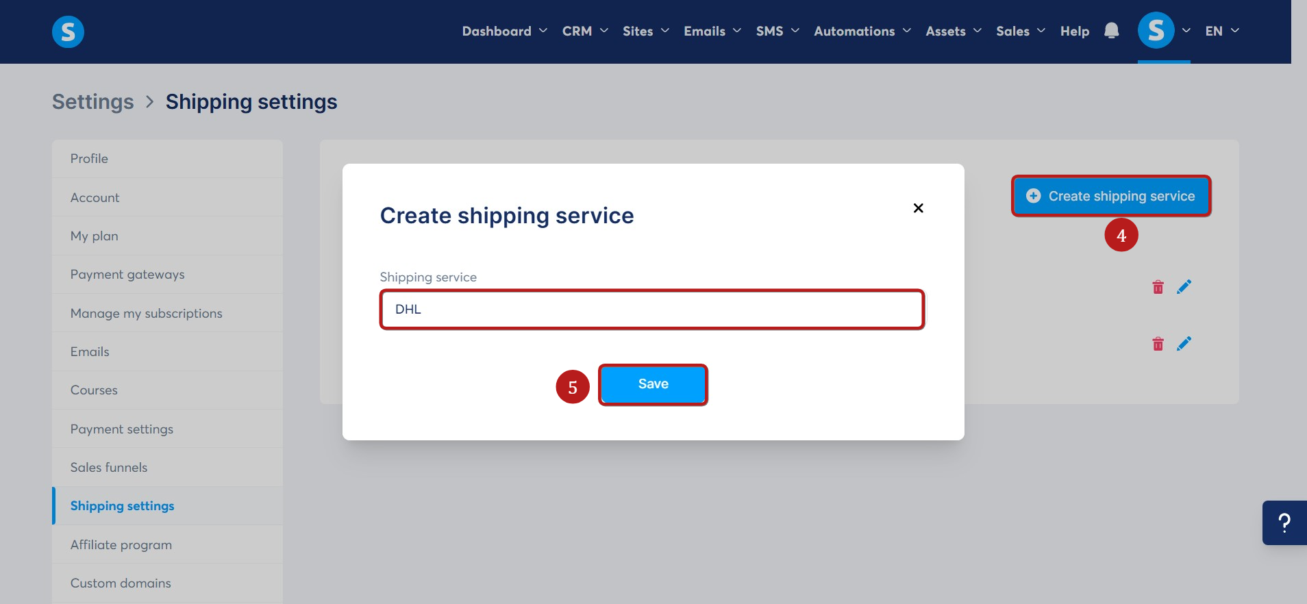 A popup will appear asking you to enter the name of the shipping service and click on Save (5) to confirm.