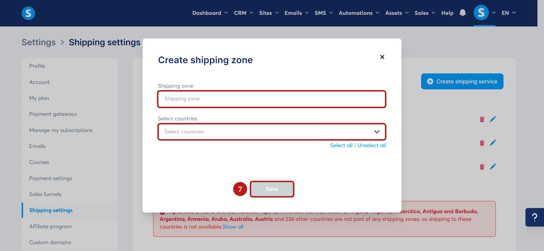 A popup will appear to create a new zone, where you need to choose the shipping zone and the countries. Then, click on Save (7) to confirm the new zone.
