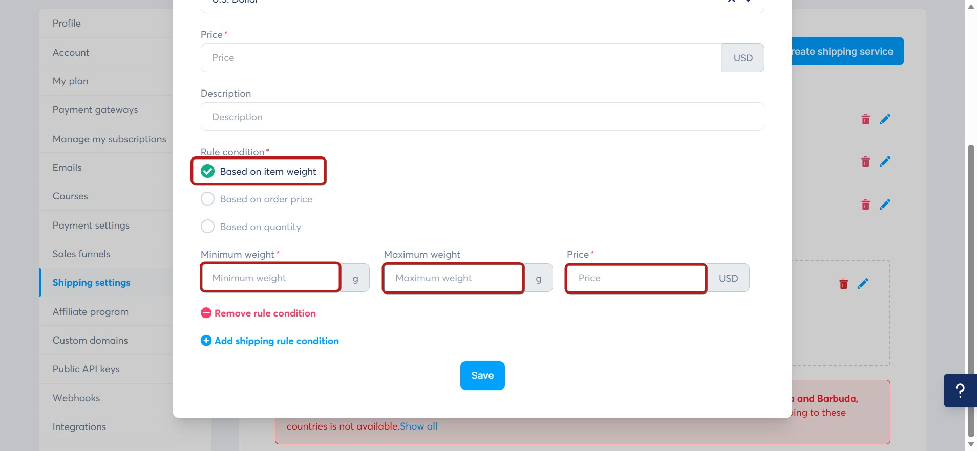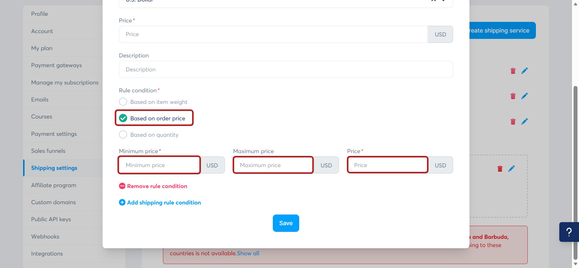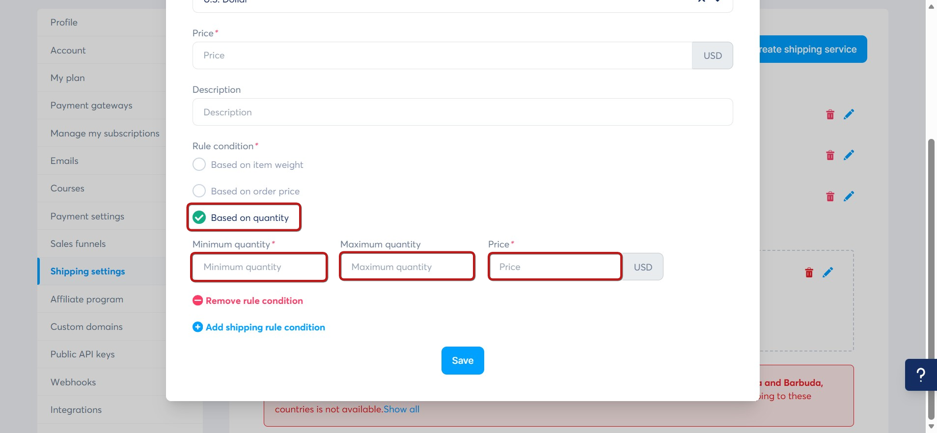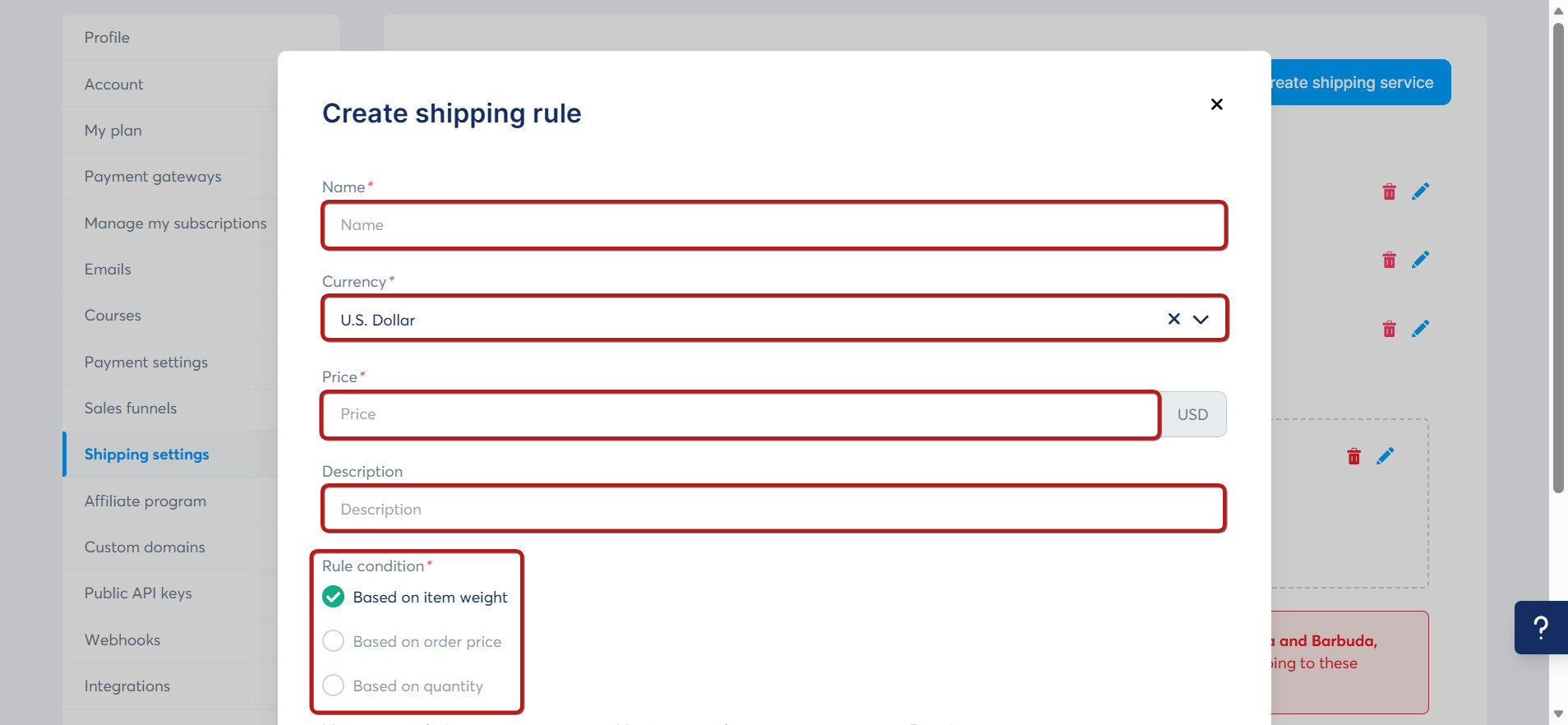 When creating a shipping rule, you have the option to create rules based on weight, order price, or quantity.