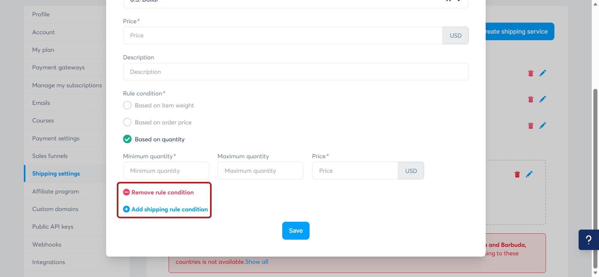 You can always add more shipping rules conditions by clicking on Add shipping rule condition or delete exisiting ones by clicking on Remove rule condition.