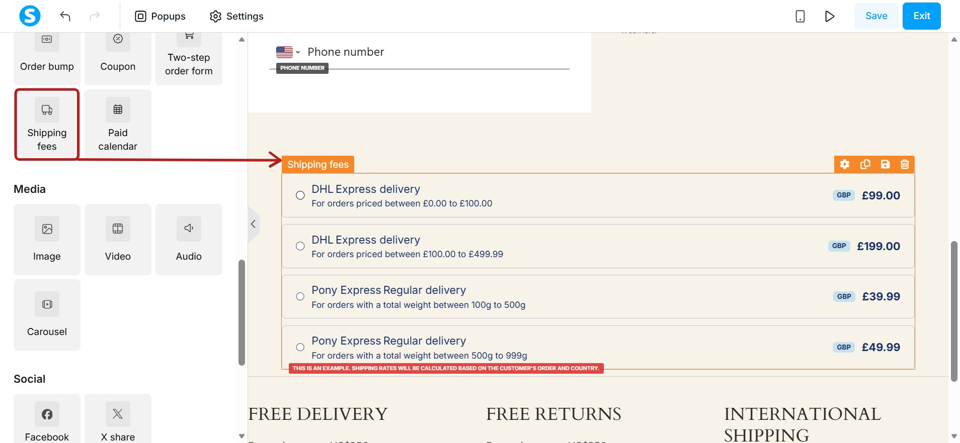 When adding physical products to an order form, you must include the item Shipping Fees by dragging the element into your page editor.