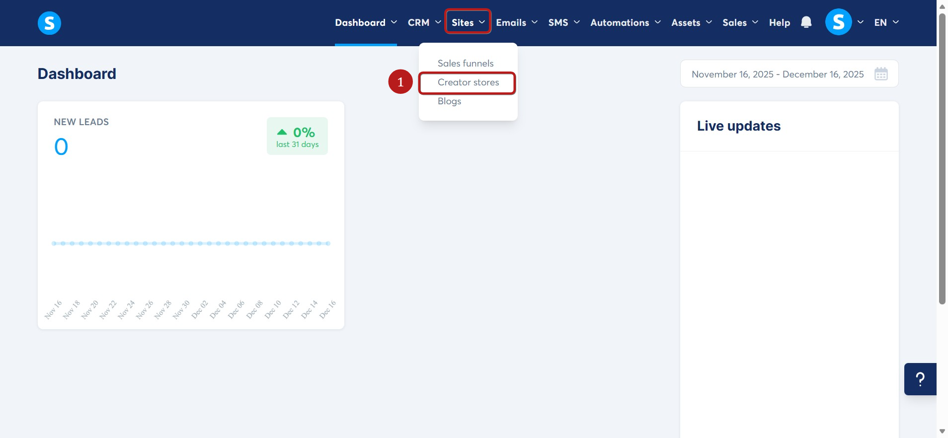 A pop-up will appear where you need to enter the name, domain, URL path, and choose the language, then click on Save (3) to complete the new creator store creation.