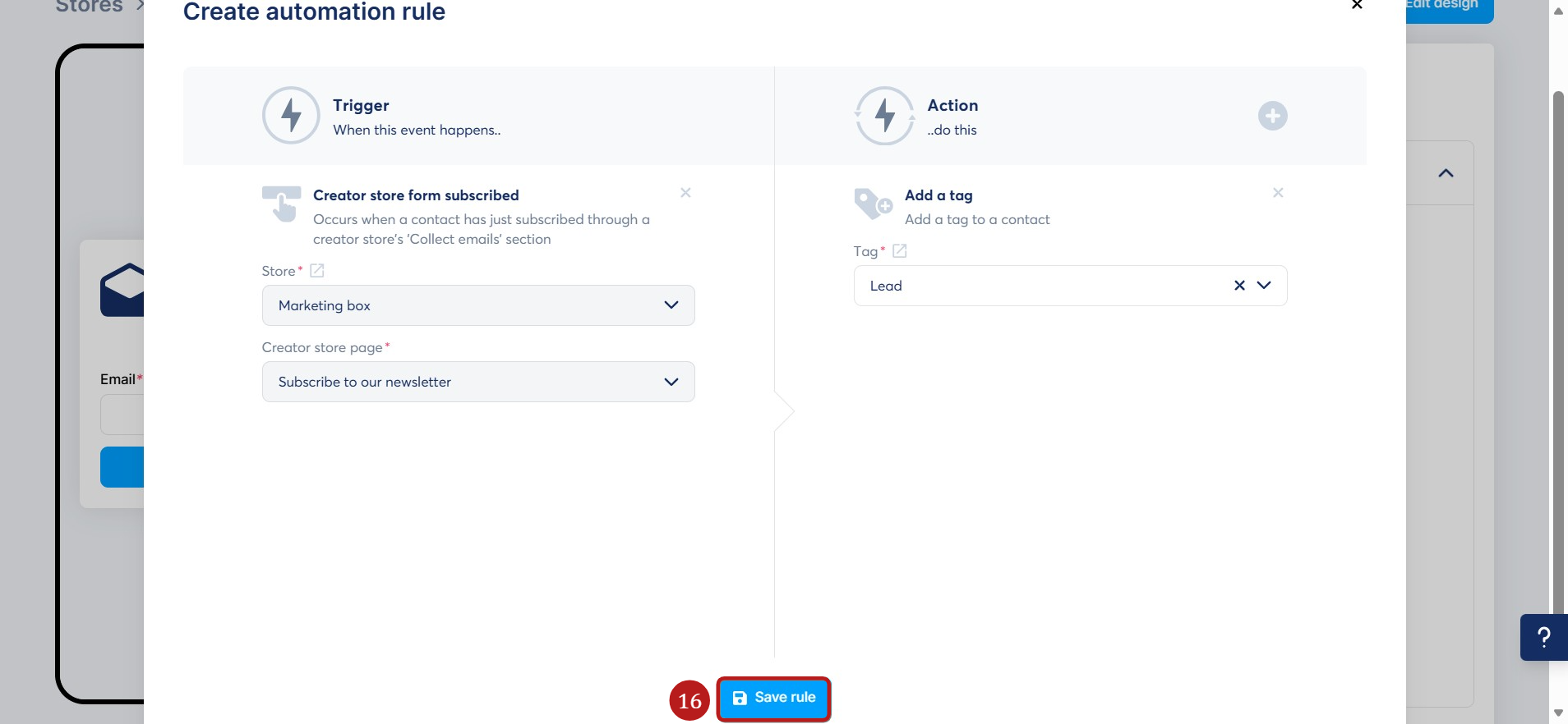 In the pop-up window that appears, choose Creator store form subscribed as the trigger, then select the action you want to trigger after a lead subscribes through your digital store’s Collect emails section (in this example, we chose to add a tag). Finally, click on Save rule (16).