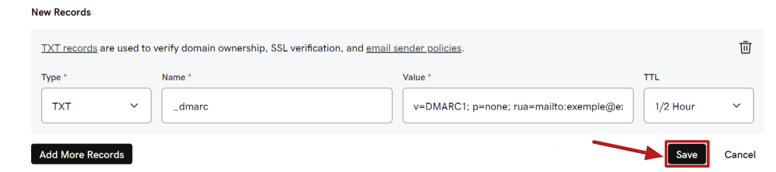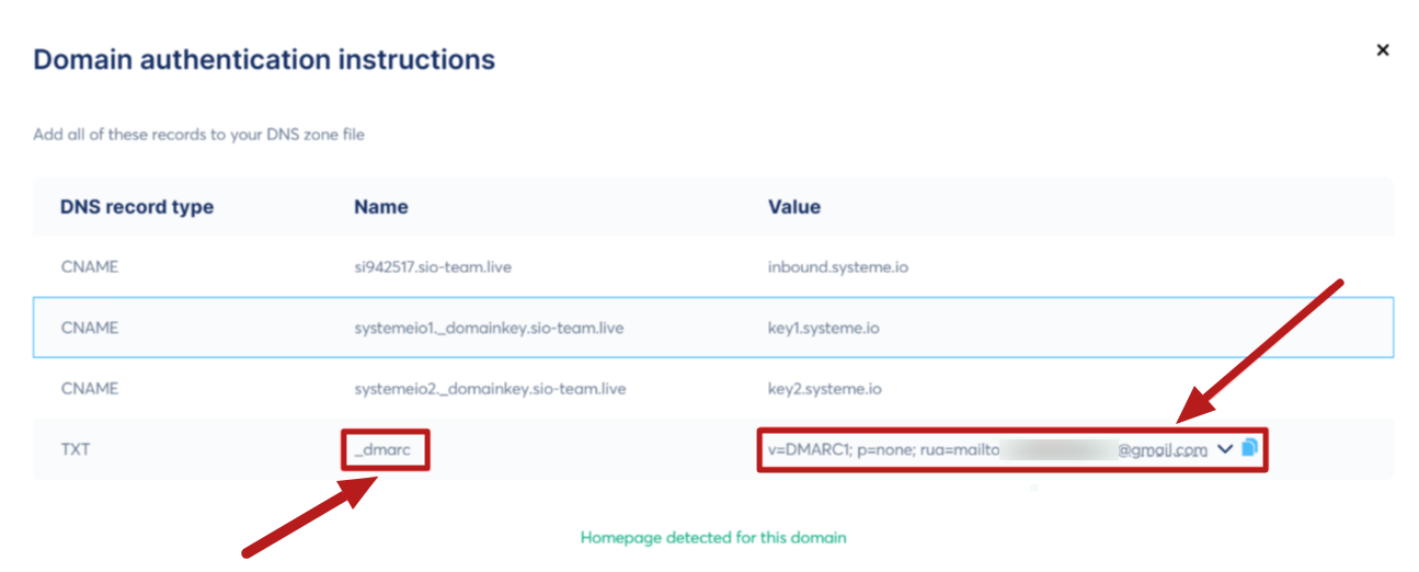 One of the essential steps to complete the authentication of your domain is to add a DMARC record. You can find the necessary values in the popup window containing your DNS records.