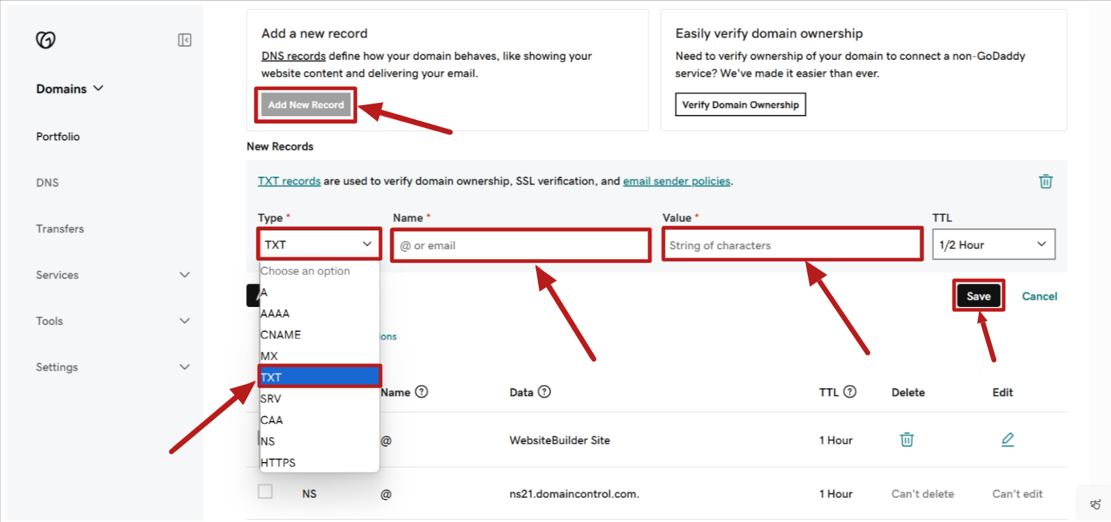 1. Click Add New Record and select TXT from the Type dropdown menu.