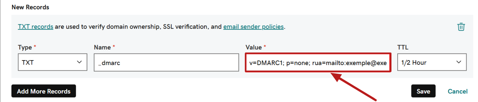 v=DMARC1; p=none; rua=mailto:example@example.com