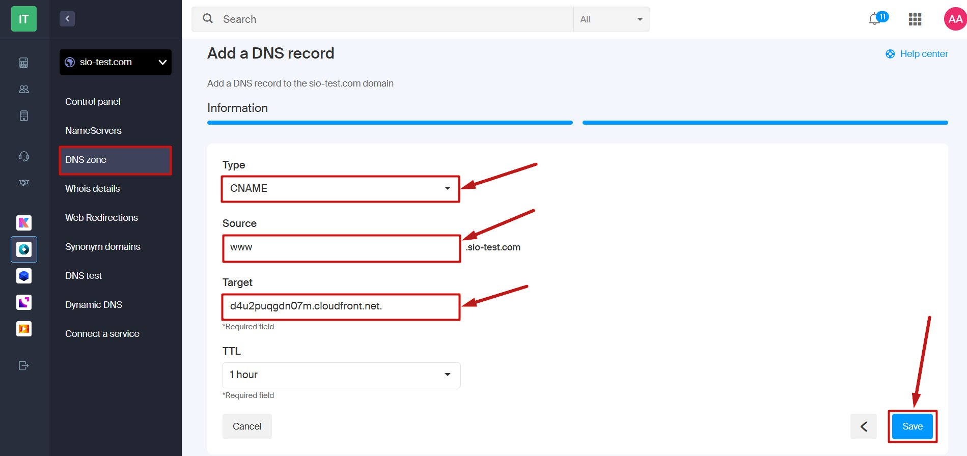 - Go to the DNS zone for your domain name, then click on Add a record.