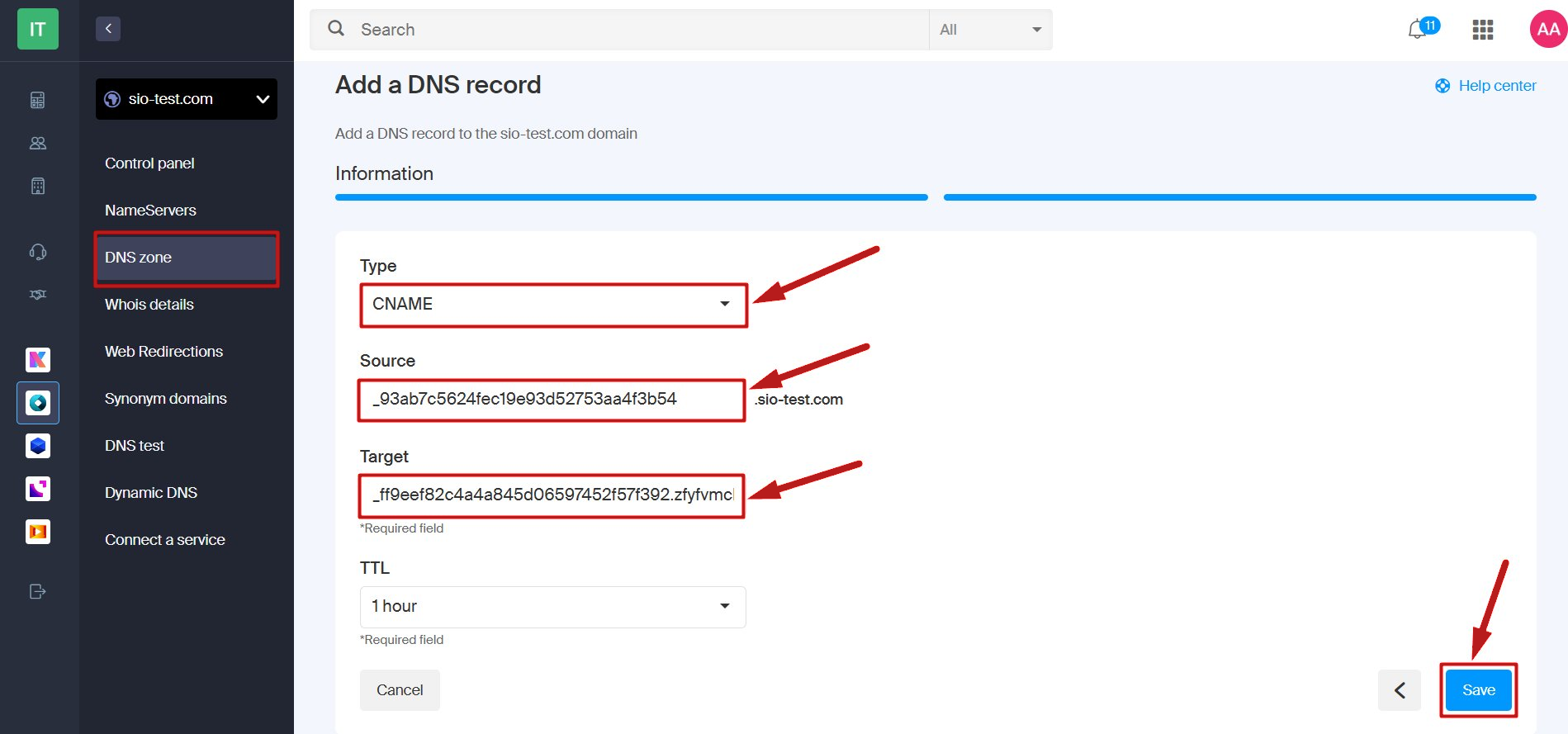In this example, we will connect the domain www.sio-test.com to systeme.io.