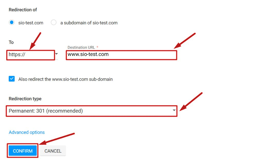 - Enter www.domain-name.com in the Destination URL field. In our example, we entered www.sio-test.com.
