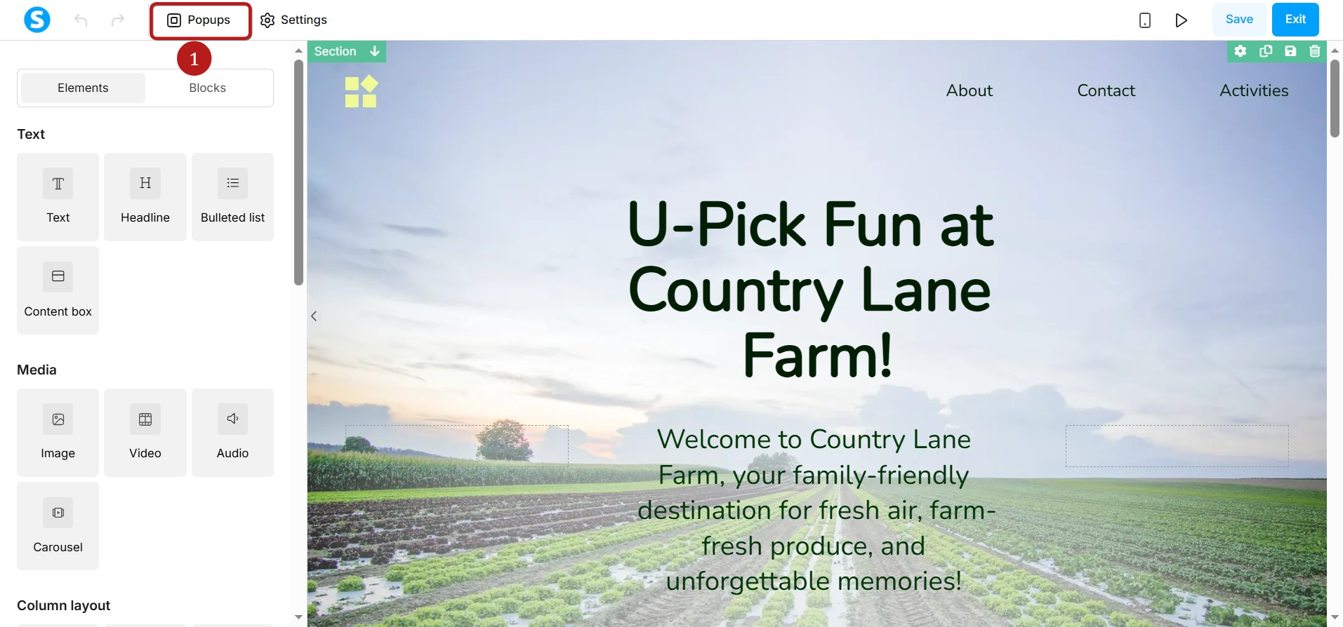 In your page editor, click on the Popups button, located in the upper left of the page (1).