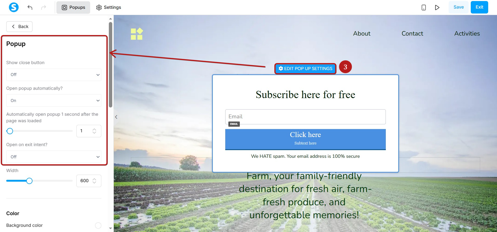To display the popup options, click Edit popup settings, located above the popup form (3).