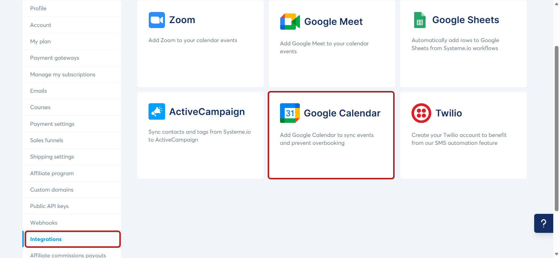 3. Click on Google Calendar among the various available integrations to add a Google account to your systeme.io account.