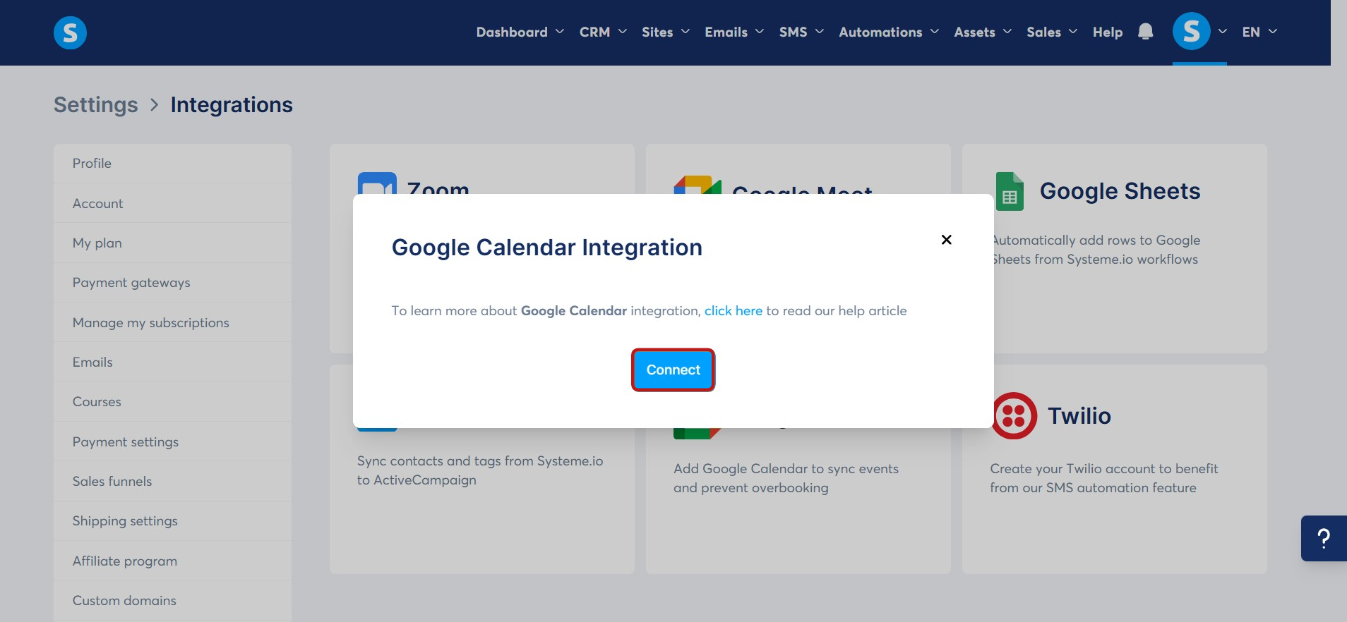 Note: Google Meet will be connected by default to your systeme.io account following the Google Calendar integration.