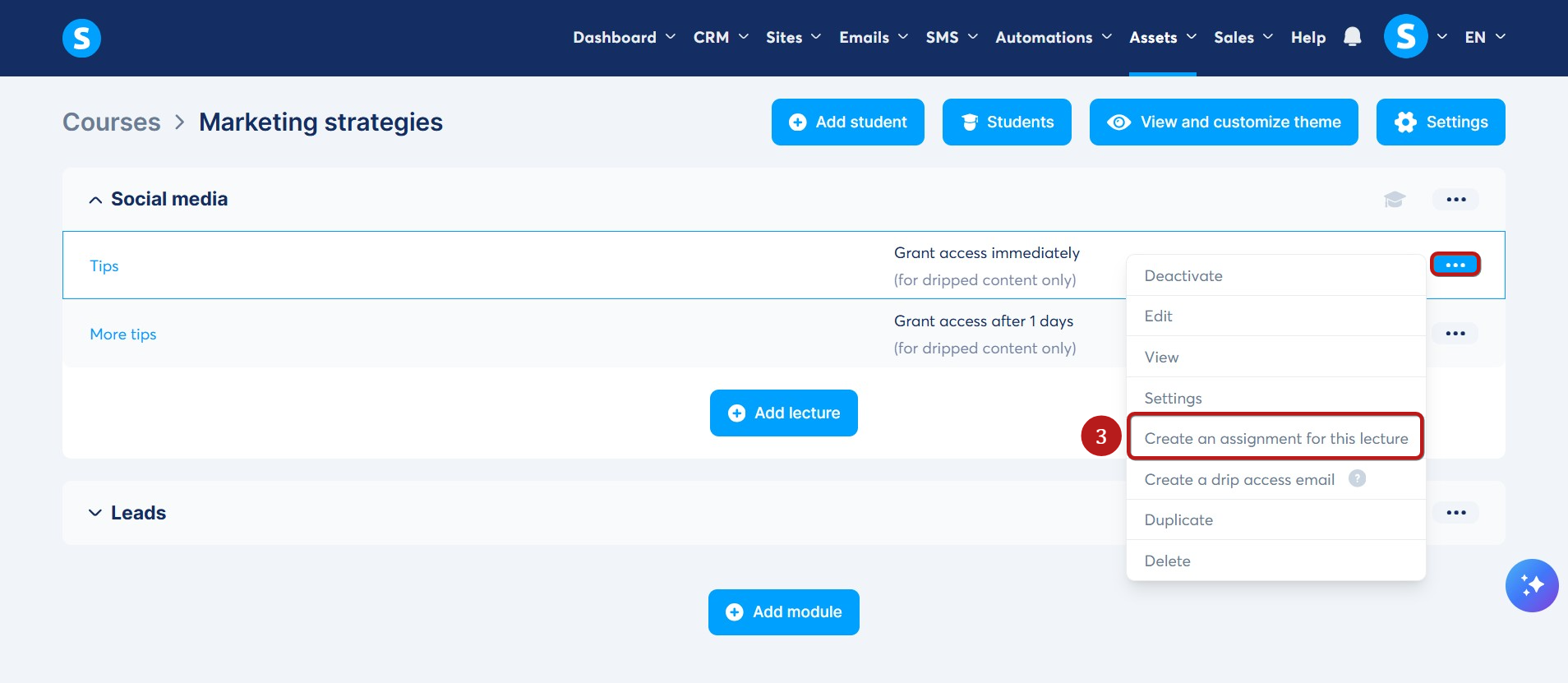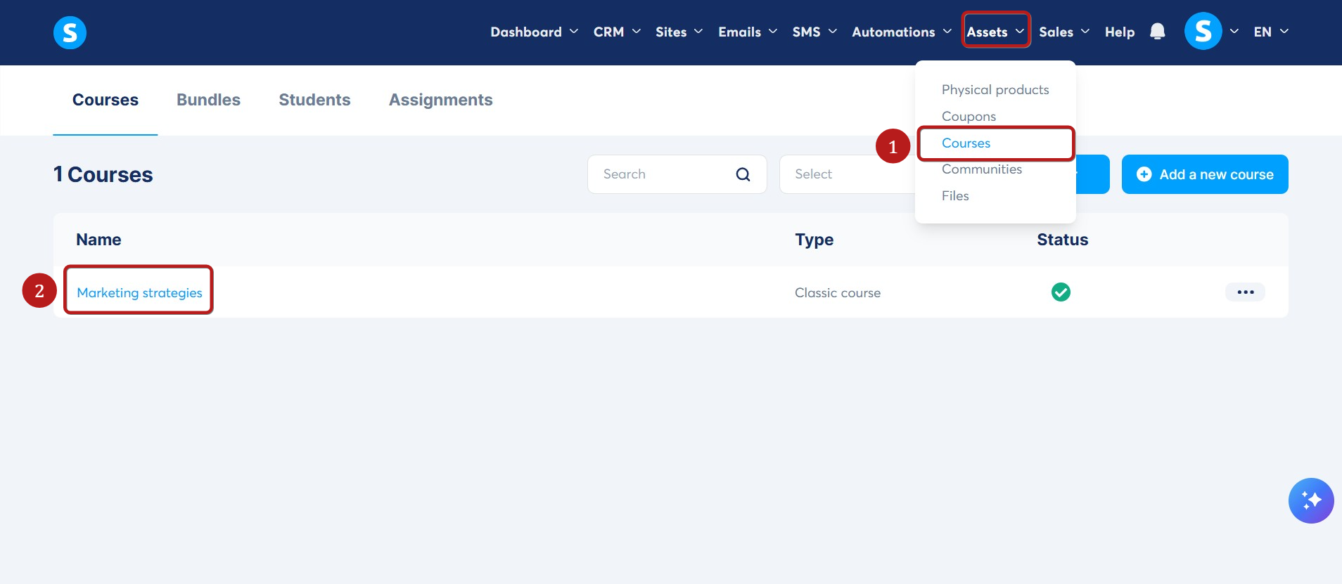 To do this, click Assets in the navigation menu, then select Courses (1). Open the course and locate the lecture where you want to add the notification email (2).