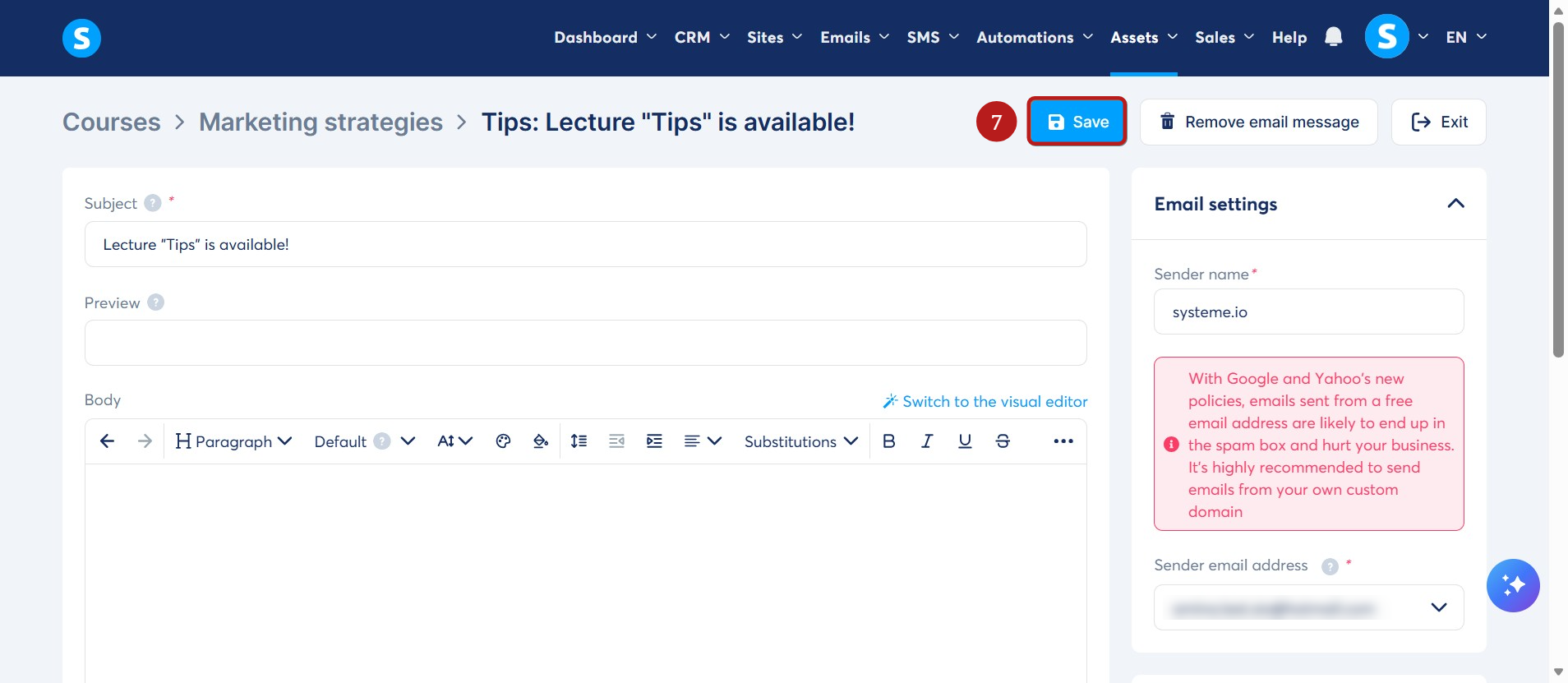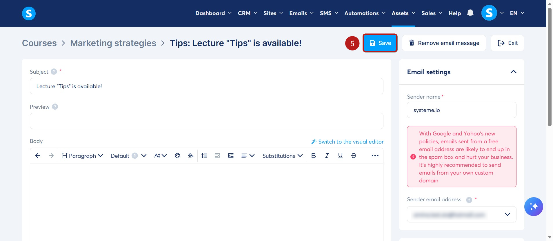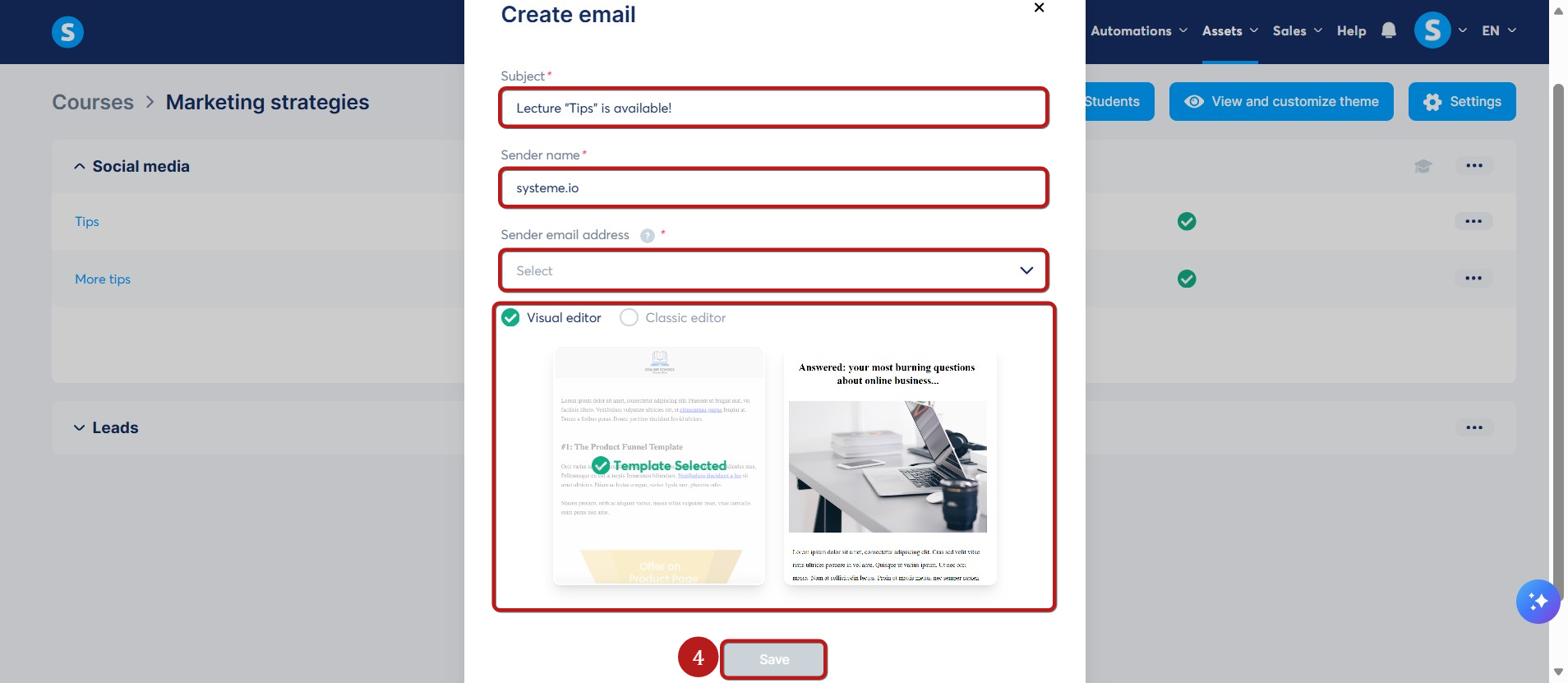 In the popup window, enter the subject, sender name, and sender email address. Choose your preferred email editor (Visual editor or Classic editor), then click Save (4).