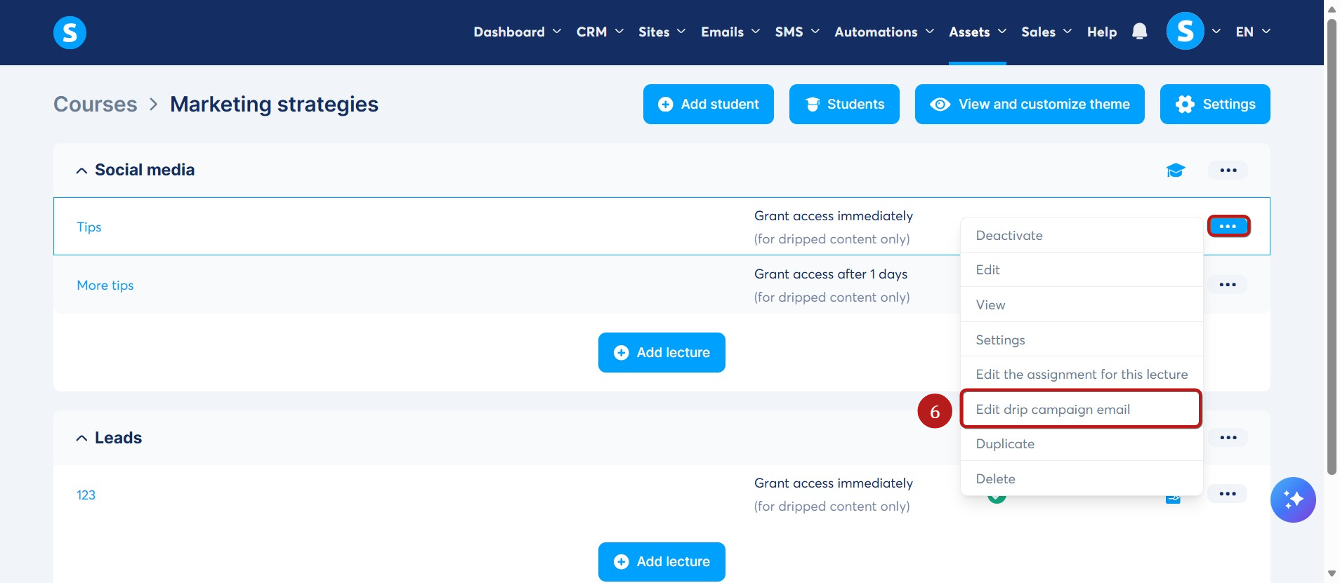 To edit the email later, click the three dots next to the lecture and select Edit drip campaign email (6).