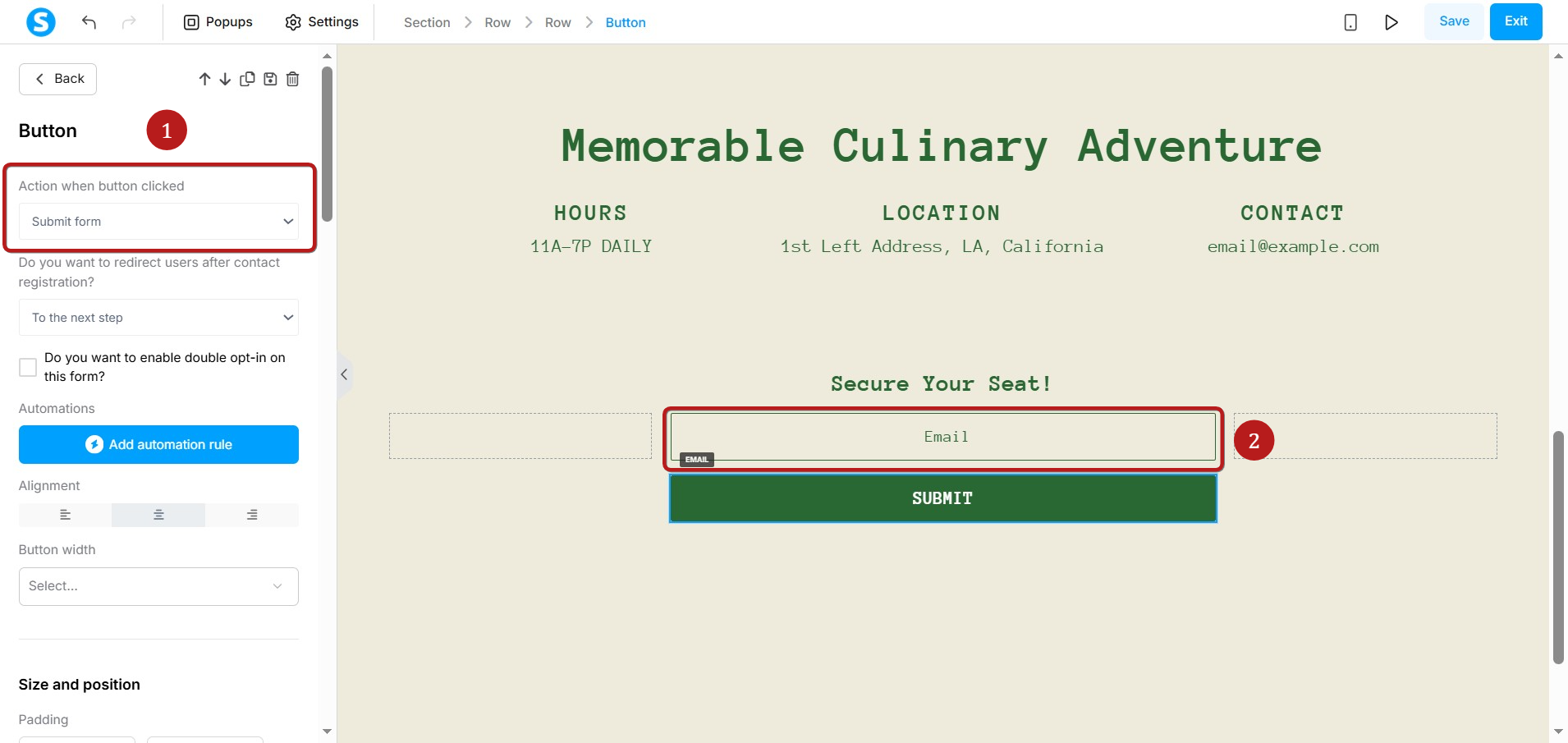 When you set a button to Send form (1), you must also include a form field for contacts to enter their email address (2)