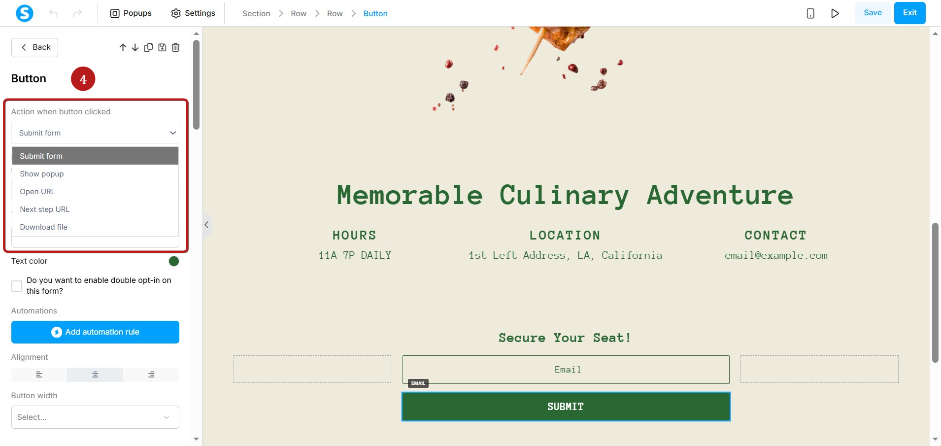 Second, check if you are using the right button action (4). If your goal is not to collect an email (for example, you just want to link to another page), you must change the button action. Select Open URL or Next step URL instead to stop receiving this error.
