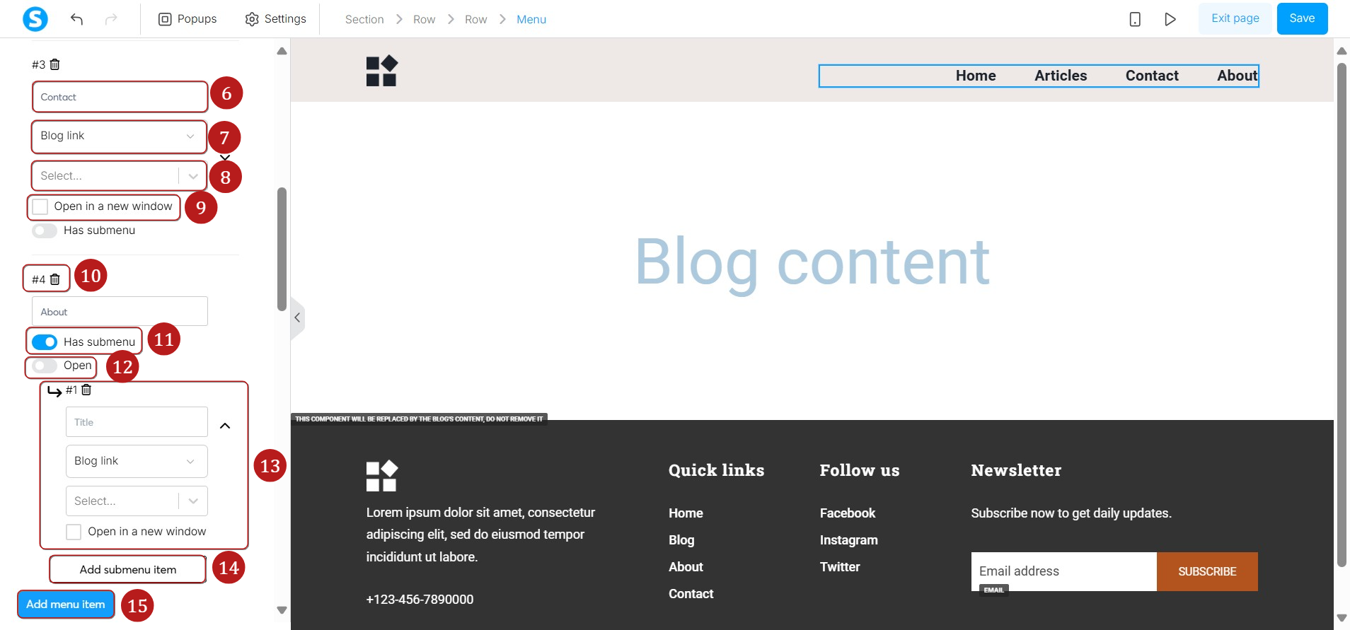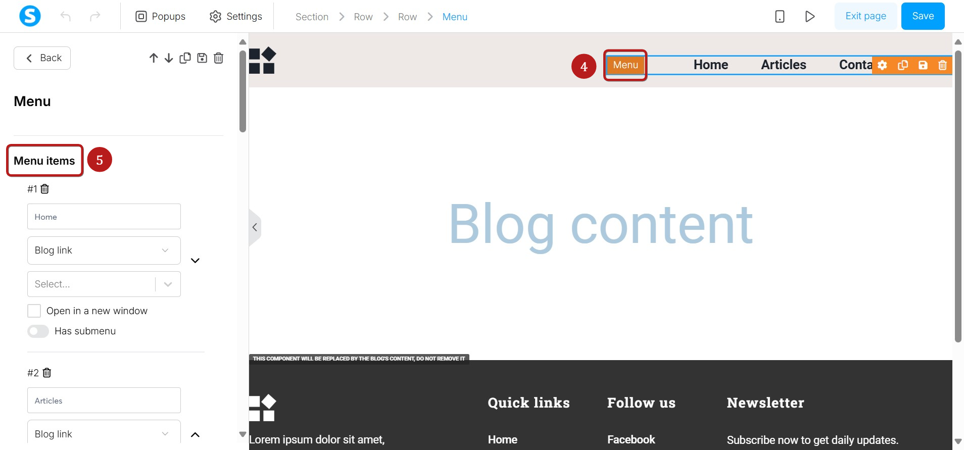 The blog layout editor page will open. Here, click on the Menu (4) item to access its settings. All Menu items (5) will appear.