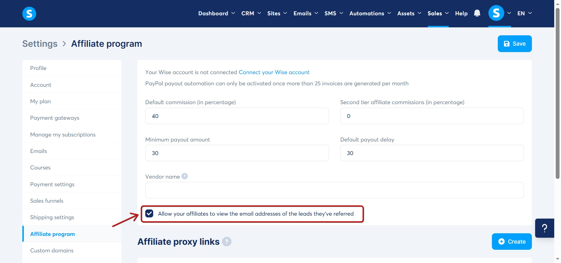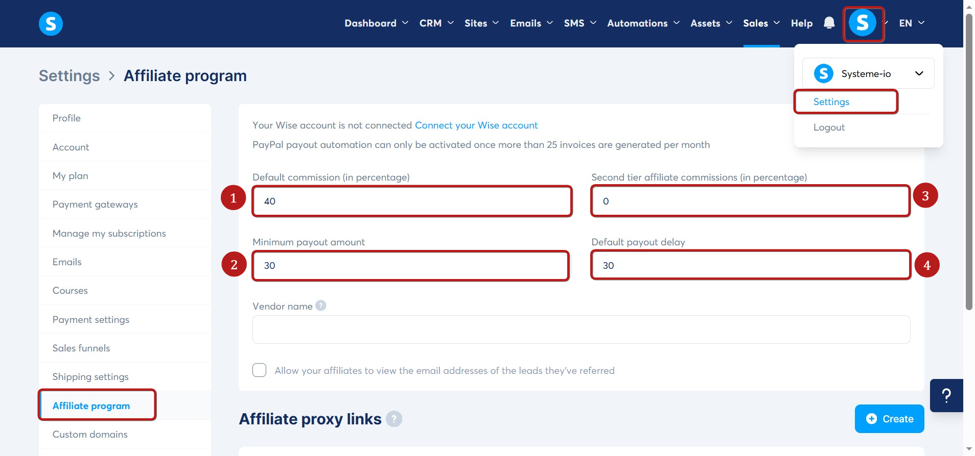 Systeme.io's affiliate program settings